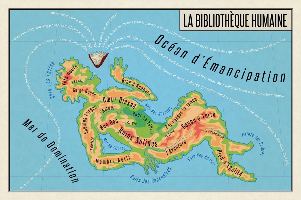 Une bibliothèque humaine ?! Genre un humain dans lequel on range des livres ? Ou genre des étagères de livres avec une tête, des jambes et des bras ? Non ! Une bibliothèque humaine est d’un genre qui privilégie la rencontre et le témoignage. Son principe est simple : vous êtes accueilli-es par un duo de bibliothécaires et devenez immédiatement des lecteurs et lectrices.